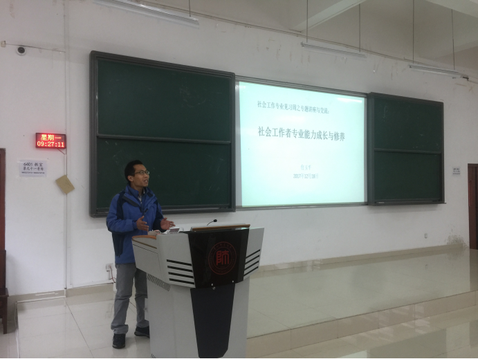 在詹玉平老师主讲的主题为“社会工作者专业能力发展与修养”讲座中,詹老师首先与同学们分享了他自己的学习与工作经历,并详细介绍了在员工阶段如何进行社会实践以提高自己的实践能力为今后的工作奠定基础,在工作阶段如何开展社会工作服务,如何进行项目管理,以及如何提升自己的专业能力与修养,最后,同学们就目前存在的一些困惑及今后的就业取向与詹老师进行了交流。