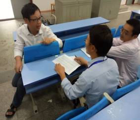 见面会上,贵阳市民族中学的童主任与刘荣昆、黄晶老师就实习同学工作、学习、生活等方方面面的问题进行了协商。